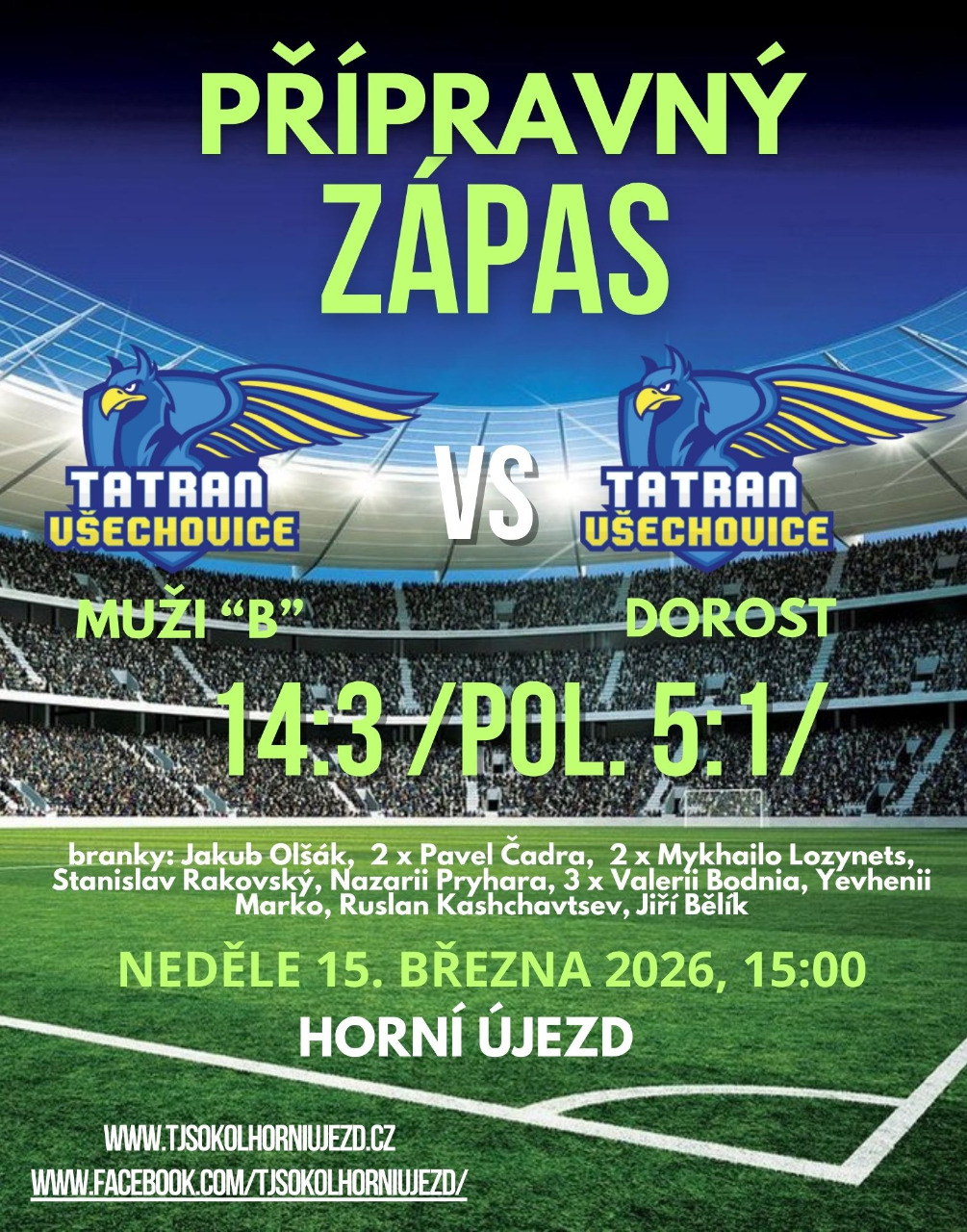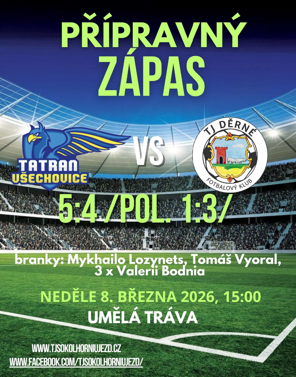 V neděli 8. března odehrál náš tým první přípravný zápas před zahájením jarní části soutěžní sezóny 2025/2026. Naším soupeřem byl po roce opět tým TJ Děrné u Fulneku, který hraje okresní přebor, tedy nově 8. ligu OFS Nový Jičín. Měli jsme nakonec k dispozici široký kádr a rotovali sestavou, zkoušeli nové hráče a posty. V zápase jsme neustále dotahovali skóre, abychom zápas zvrátili v náš prospěch v samotném závěru zápasu, k čemuž přispěl hattrickem levý záložník Valerii Bodnia. V zápase jsme se museli obejít bez zraněného Marka Jakubce a gólmana Františka Symerského, kterého v bráně nahradil Jiří Floreš z našeho dorostu Tatran Všechovice. V zápase jsme vyzkoušeli tři možné nové posily Yevhenii Marko, Ruslan Kashchavtsev a René Kusein. Druhý přípravný zápas nás čeká v neděli 15. března, kdy bude našim soupeřem náš dorost Tatran Všechovice. Původně se měl zápas odehrát od 15:00 na umělé trávě SK Hranice, ale vzhledem k příznivým klimatickým podmínkám a terénu se již odehraje na přírodní trávě, a to v našem Sportovním areálu Pod Břízami.