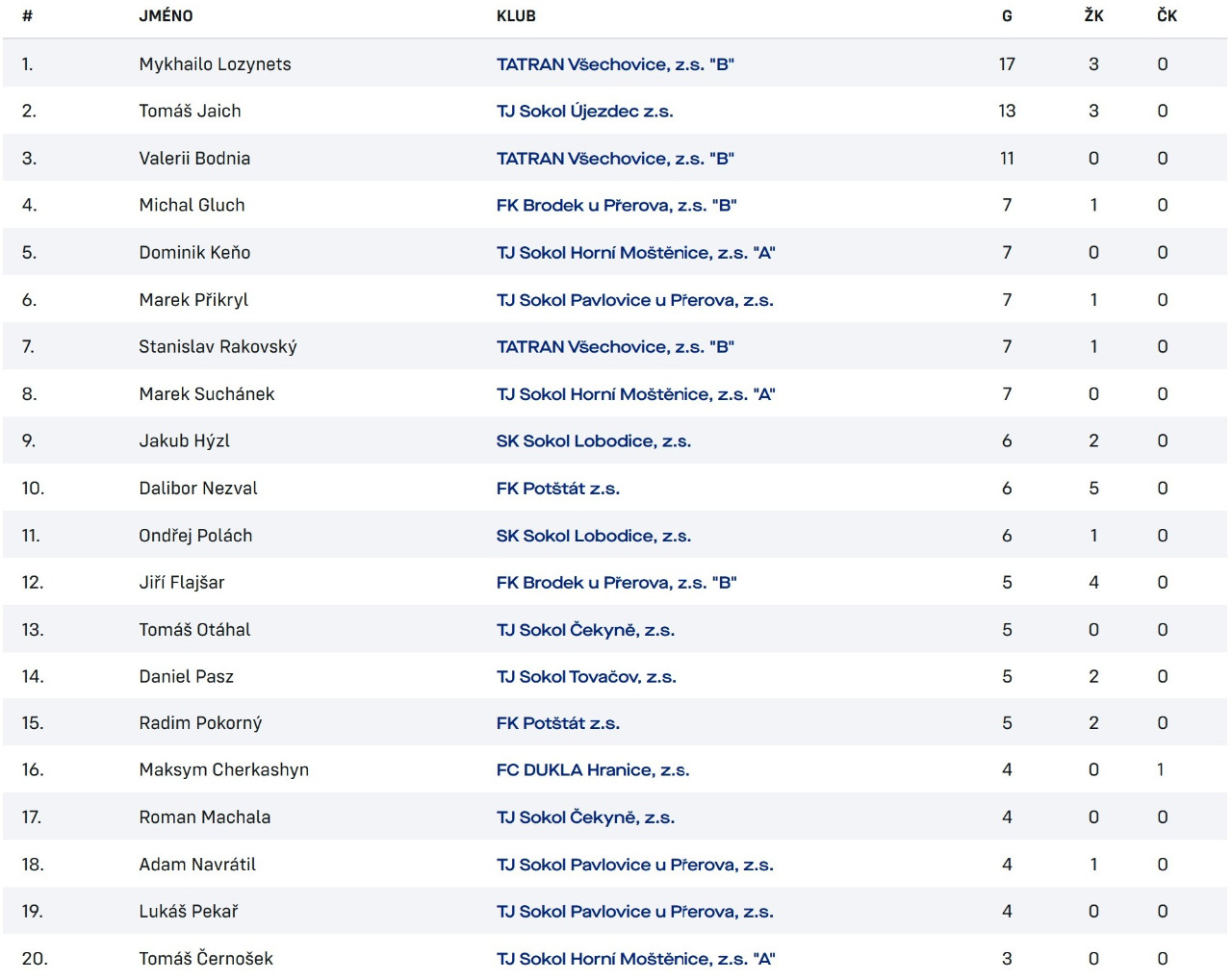 Tabulka střelců po 26. kole - sezóna 2024/2025 - jaro 2025: